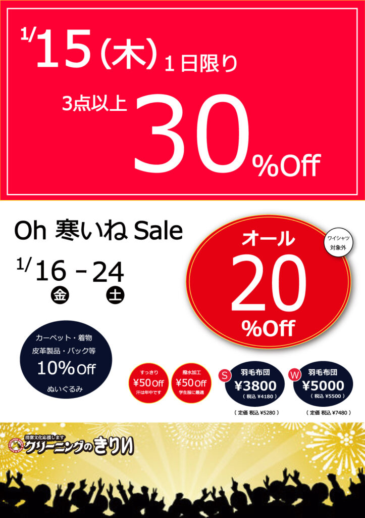 トップページきりいのブログ1/15☆3点以上30%OFF 1/16スタート☆オール20%OFF 2026.01.13 1/15☆3点以上30%OFF 1/16スタート☆オール20%OFF スタッフブログ セール情報