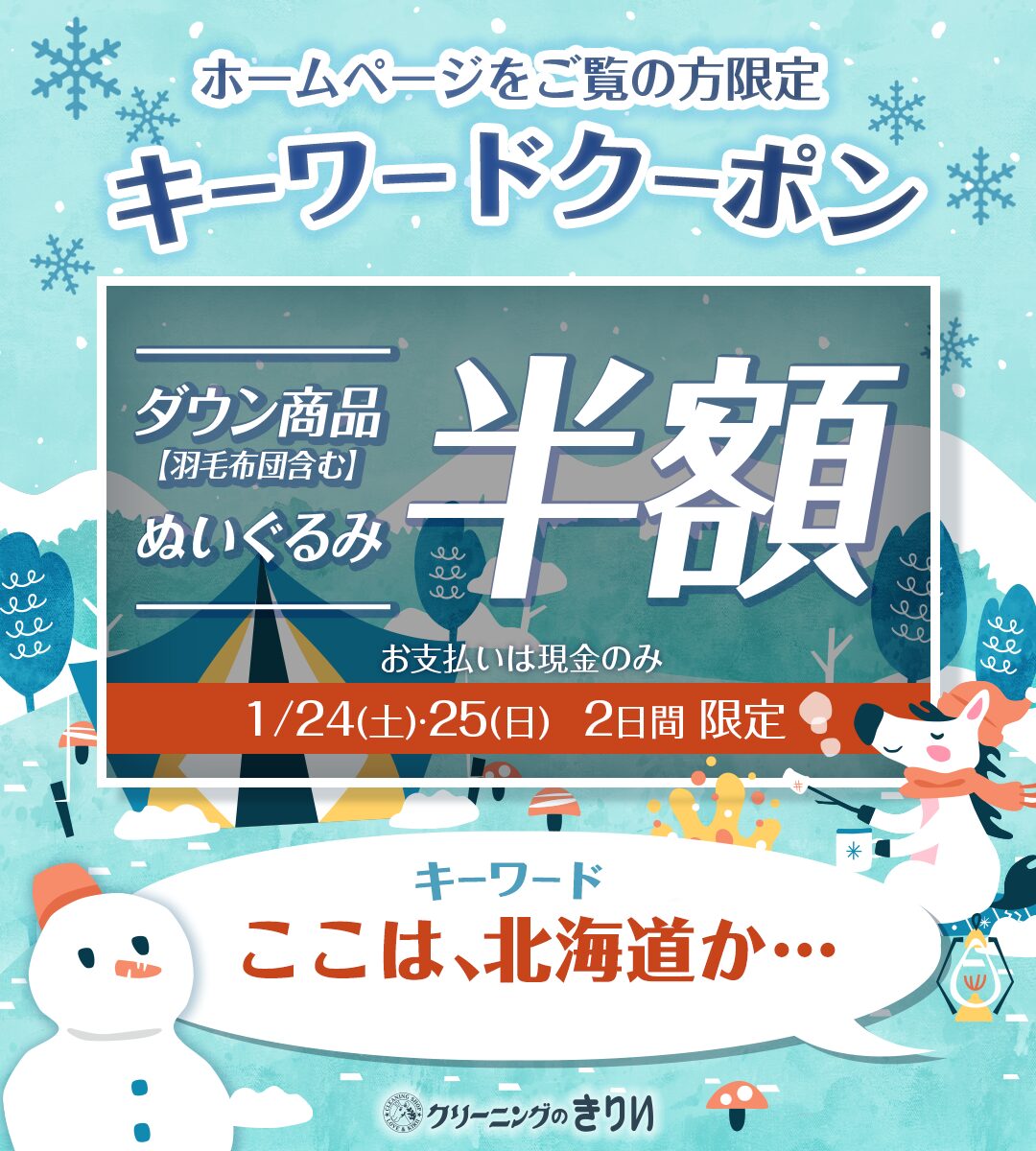 トップページきりいのブログ今月のホームページクーポン! 2026.01.23 今月のホームページクーポン! きりいのサービス ホームページクーポンいつもホームページをご覧いただいているお客様へ感謝の気持ちを込めてクーポンをプレゼントいたします!クーポンのご利用は、画像の中に書かれているキーワードをカウンターでお伝えください。1月24日(土)25日(日)の2日間限定クーポンです。店舗案内ページはこちら–ご注意–*カウンターでキーワードをお伝えください。*期間中、何回でもご利用できます。*こちらのクーポンは外注品対象外です。*その他サービス・クーポンとの併用はできません。お近くの店舗を探す 店舗案内ページへ